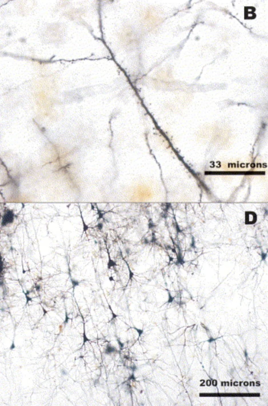 In 2022, I was reading various papers on brain preservation (as one does), when I came across Rosoklija 2013. If I recall correctly, I had already seen this paper but was re-reading it with a different eye. They studied human and monkey brain tissue that had been preserved in formalin for periods ranging from 15 months to 55 years, using the Golgi-Kopsch silver staining method to visualize neuronal structures. They reported that even after 50 years of formalin fixation at room temperature, the method yielded excellent results. In particular, they had this figure: