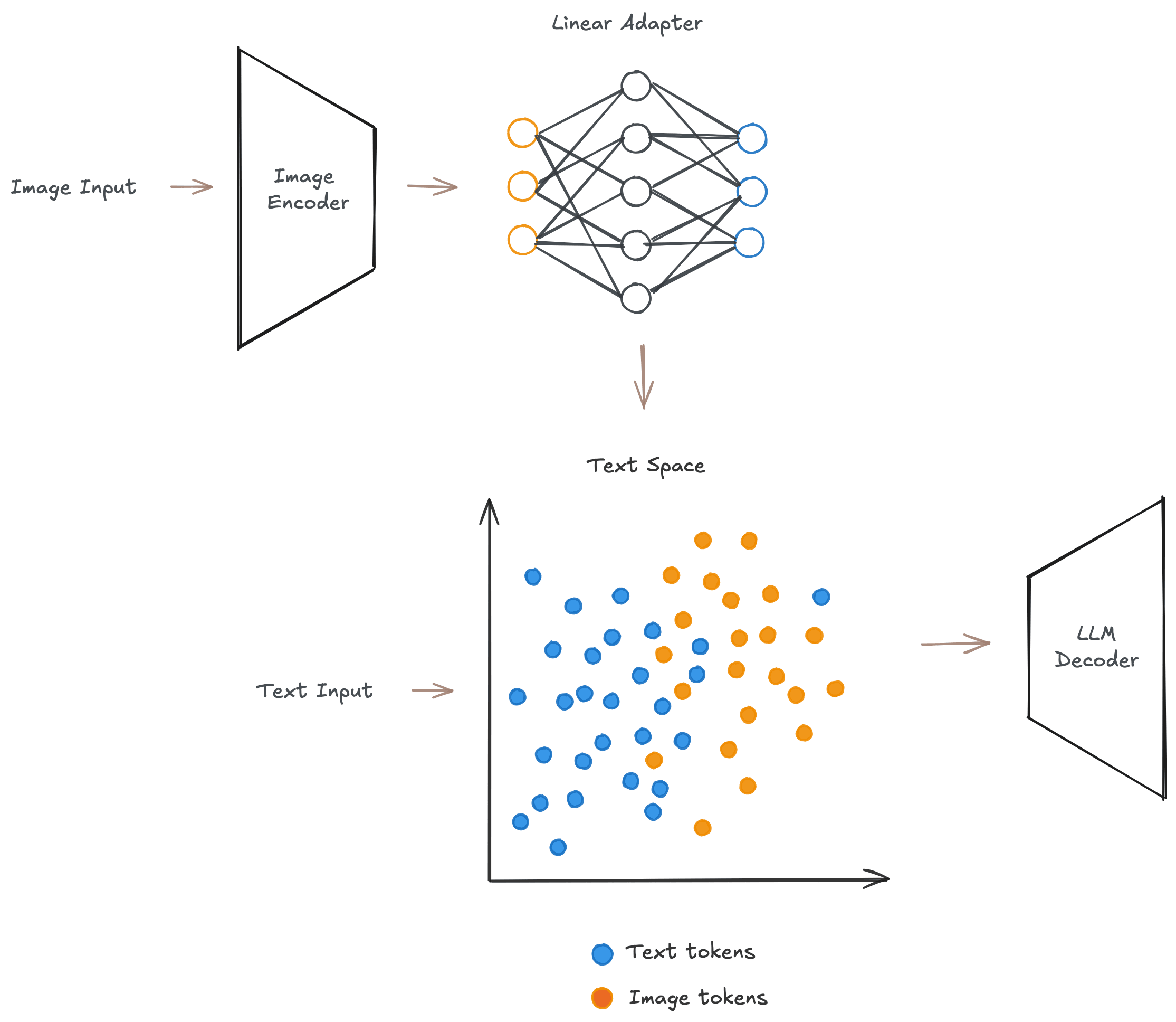 Geometric separation: Text tokens and vision tokens occupy significantly different representation spaces inside the LLM. They reside in distinct “narrow cones” in the feature space[Shukor et al]. These vision tokens have no semantic meaning when decoded directly to the LLM vocabulary space, which means that visual features are fundamentally misaligned with the pretrained token embedding space[Neo et al]. In fact, the visual features projected into the LLM’s space by the adapter layer initially occupy a subspace that is nearly orthogonal to the LLM’s pretrained textual embedding space[Shukor et al].