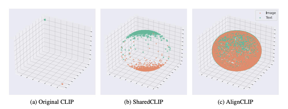Considering the random initialization of encoders embeds different modalities in distinct subregions of the shared representation space, some researchers propose sharing the learnable parameters between vision and language encoders to increase inductive bias toward better cross-modal alignment. They additionally propose a semantically-regularized intra-modality objective function, AlignCLIP, that enforces larger distances for the image embeddings of semantically dissimilar images, and smaller distances on those of similar images[Eslami et al].