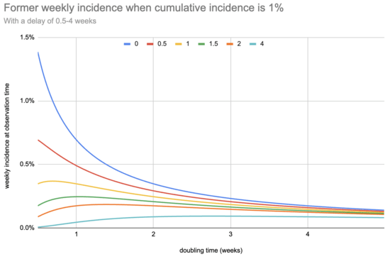 Recall that last time we estimated that, for something doubling weekly, when 1% of people have ever been infected then 0.69% of people became infected in the last seven days. With a delay of a week, however, by the time we learn that incidence has hit 0.69% many more people will have been infected and we’d have missed our 1% goal by a lot. The effect of delay is that during this time the epidemic will make further progress, which will depend on the growth rate: with a shorter doubling period there will be more progress. Can we get an equation relating cumulative infections to delayed incidence?