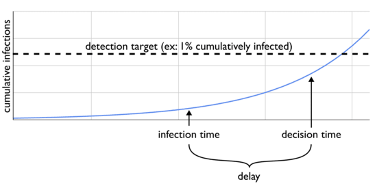 This isn’t the whole story, though, because many of the actions that you would want to do post-discovery are more urgent with higher growth rates. This means you need to count the delay of your core response (ex: implementing NPIs) in the total delay: you can’t allocate the entire delay budget to the detection system.