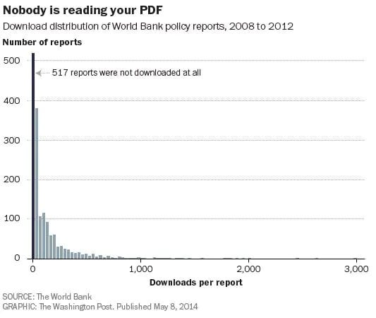 One of my favorite factoids of all time comes from a study the World Bank conducted on its own policy papers several years ago. The methodology was simple: researchers just counted the number of times each paper had been downloaded between 2008–12. They found that three-quarters of these papers, each one representing likely hundreds of hours and thousands of dollars of investment on the institution’s part, were downloaded fewer than 100 times. Nearly a third had never been downloaded even once — not even by their authors!