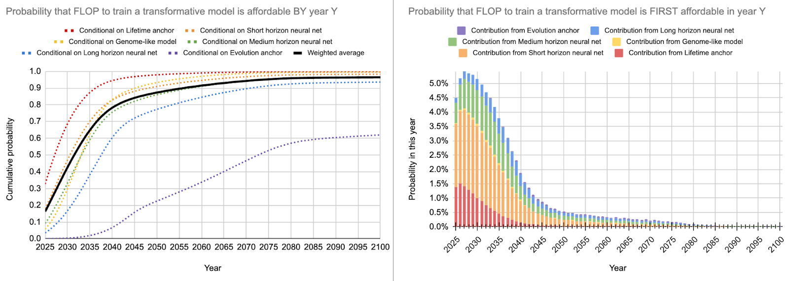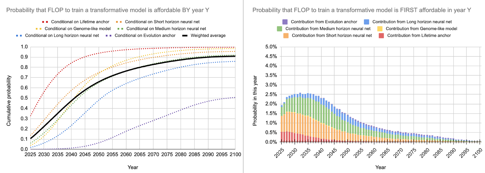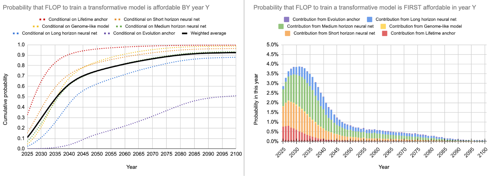 Important: To model the probability of transformative AI in a given year, the bio anchors report uses the availability of compute (e.g. see this summary). This means that the bio anchors approach is NOT a prediction for when this AI has been trained and rolled out or when the economy has been transformed by such an ML model, it merely predicts when such a model could be trained. I think it could take multiple (I guess 0-4) years until such a model is engineered, trained and actually has a transformative economic impact.