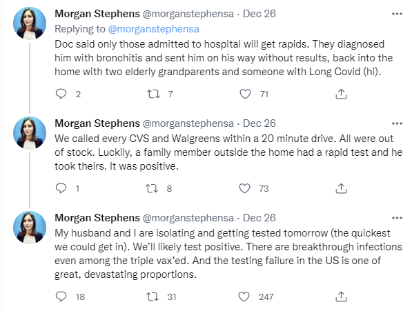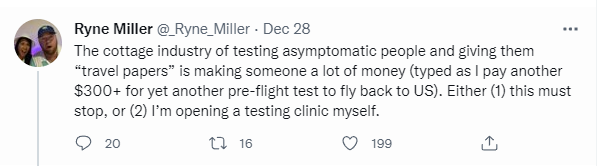 Testing lines were super long before the holidays, but that could have a lot to do with paranoid relatives demanding extra tests. Whereas this week the kids are off school and don’t require tests, and the gatherings are over, which may explain why I saw one test tent on Sunday night with no waiting line.