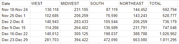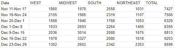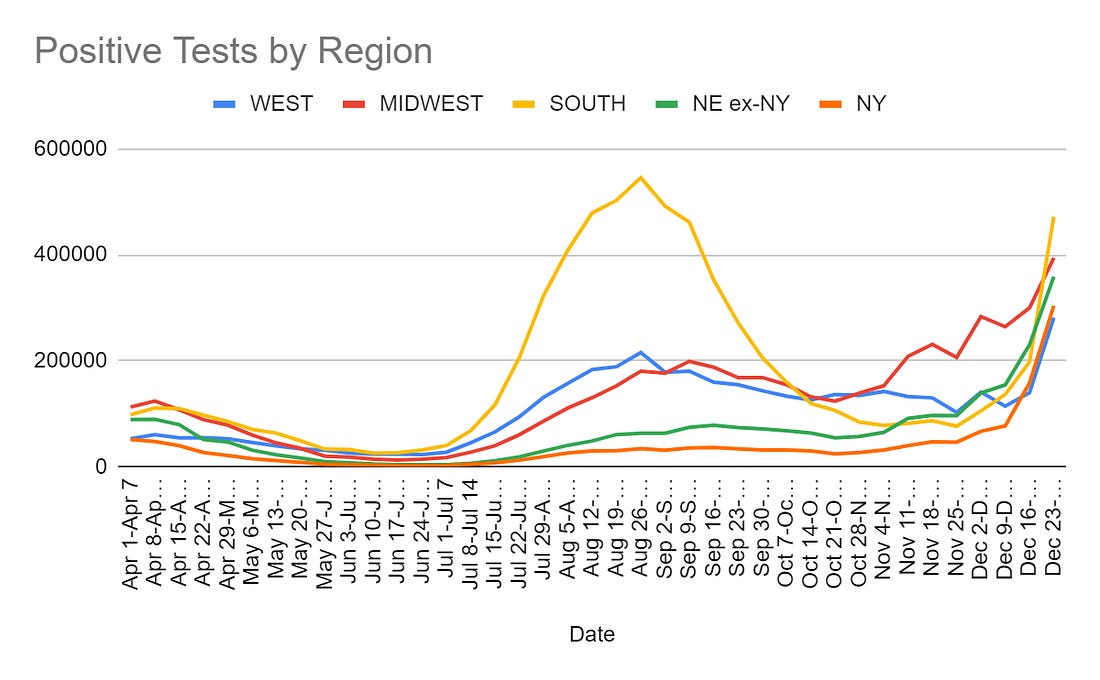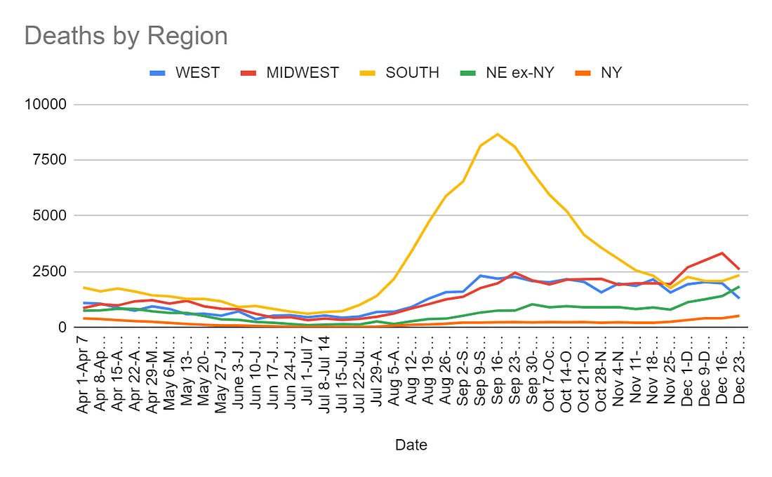 On deaths, it looks like the West and Midwest are still on vacation in terms of reporting deaths, and it’s not obvious they’re going to fix this by next week. Which means they might backfill those deaths (which would count and not be corrected) or they might continue not to report. This assumes they’ll probably at least report the correct share, but it’s hard to tell.