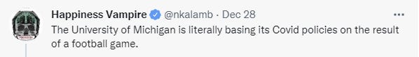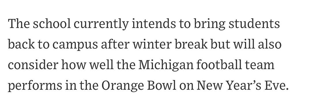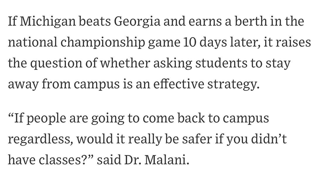 This for once is not me making fun of Michigan University and its football program. Not only did they beat the dastardly Ohio State and make the playoffs, of course they’re underdogs who might be overmatched but I still think that over all possible worlds +7.5 against Georgia is good value, and they’re asking the right questions. So this, but unironically.