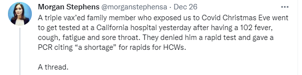 Big, difficult-to-arrange extended family gathering (~20 adults) with agreement that everyone would rapid test on the day of. Christmas morning rolls around and a crucial participant tests positive. We give her another rapid test from a different brand. Negative. A third rapid test from the same box as the first. Positive. We scramble and fortunately find a PCR site that can get us same-day service. Negative. Apparently the original box was one of the ~1% of lots that produces a false positive. But we burned through most of our spare rapid tests and most of Christmas Day figuring that out.
