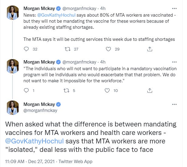 Also, sometimes you don’t have enough workers so you don’t enforce your vaccine mandate to avoid shutting down services, you can just say that, except no, you can’t say that, so you pretend bus drivers are isolated from the public.