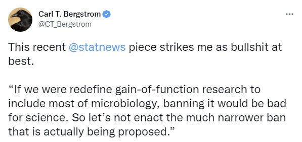 Exactly right. At best, this piece what we like to call ‘complete and utter bullshit.’ The argument is that technically ‘gain-of-function’ includes any attempt to do almost anything, so of course ‘gain-of-function’ as in ‘let’s make this virus more dangerous to see what would happen, no it won’t leak what are you talking about that definitely never happens, things don’t escape from labs’ must be fine.