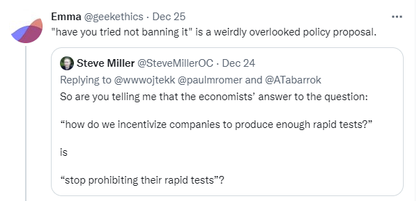 I’ve come around to the position that Molnupiravir should not have been approved because of the danger that it will create new variants. It’s a private good at the cost of a public risk, and I don’t believe we can trust people to take the drug as directed to ensure nothing bad happens. I don’t know the magnitude of the risk, but the precautionary principle attaches here, we should not have done this and I should have realized it sooner without needing to see so many others making the point.