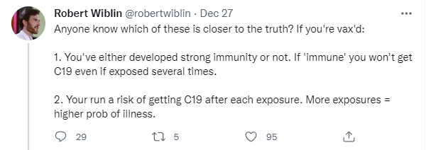 My model now says it’s a hybrid. People have different levels of antibody and other responses to the vaccines, which means some people are effectively fully immune (at least for a while), others get more limited protections, and you get some Bayesian evidence over time for where you stand based on how much risk you take and whether you get infected.