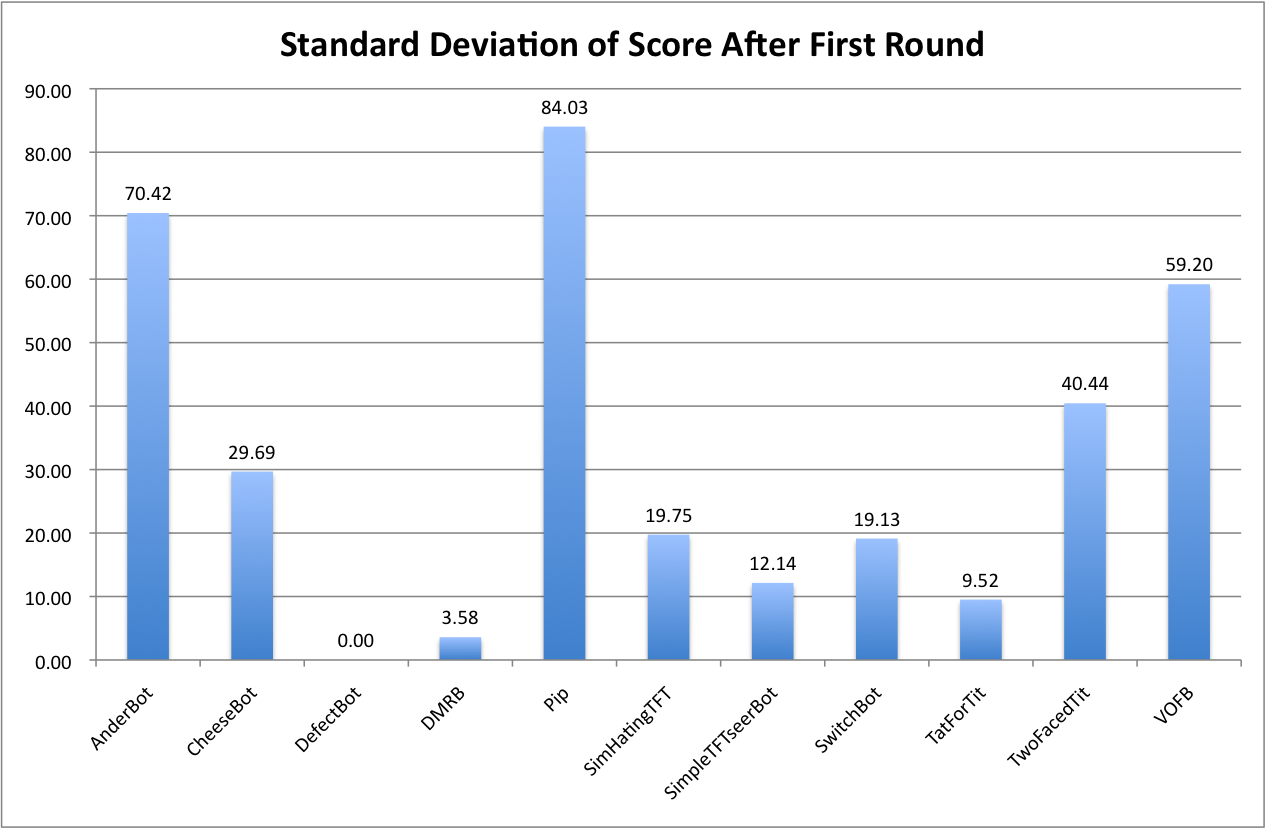 In other words, the same half of the field consistently swept the first round; AnderBot, DefectBot, Pip, and SimpleTFTseer never survived to see a second round. In general, this is because high-scoring bots almost always cooperated with each other (with the occasional backstab at the end of the round), and defected against AnderBot, DefectBot, Pop, and SimpleTFTseerBot, as these bots either did not consistently retaliate when defected against or pre-emptively defected, triggering a chain of mutual defections. Interestingly, the bots that continued on to the next round did not do so by a large margin: