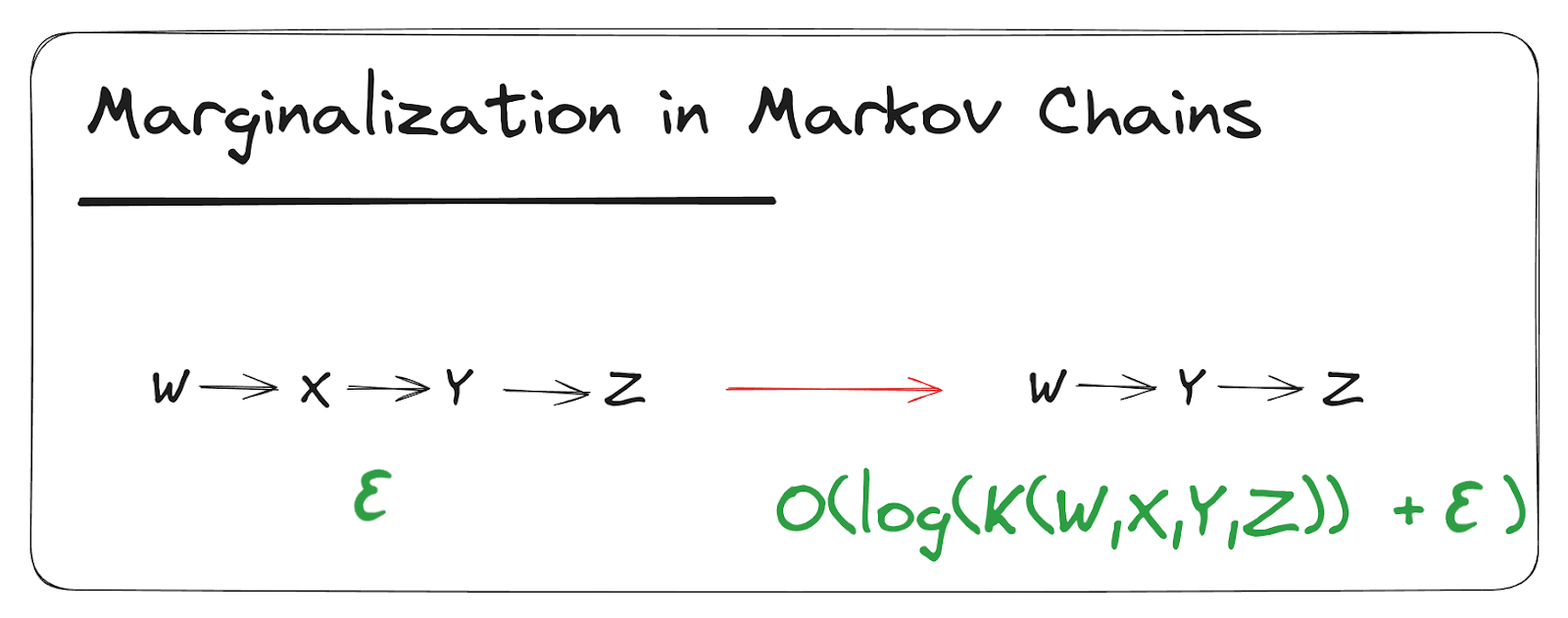When working with a longer chain , note that reversing the direction of arrows in the Markov chain and further marginalization both also cost no more than log , so we can marginalize out multiple variables and put the root anywhere for the same big- cost in the bounds.
