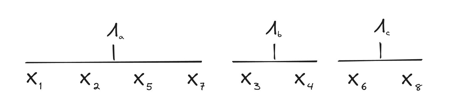Imagine that we have 8 drink-instances . We find a natural latent between and . On further investigation, we find that the same string is natural over all of , and .[4] Then we find another string which is natural over and , and a third string which is natural over and . Finally, we find that the strings are independent[5] of the strings and all those are independent of the strings .