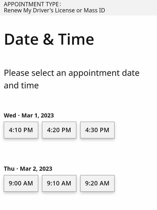 available” screen popped up for RMV offices in Boston, Attleboro,