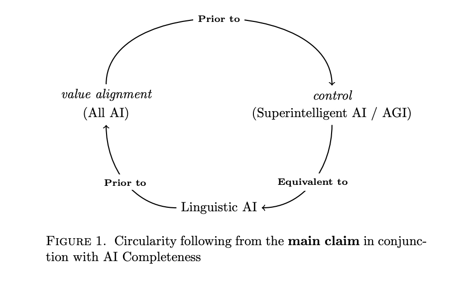 If Bostrom (2014) is correct about language being an AI-complete problem, then linguistic AI is functionally equivalent to human-level AI. If the main claim is true, then linguistic AI is, in some sense, prior to robust value alignment. But, it was suggested above (2.2.3) that value alignment is logically prior to problems of control.68 The conjunction of these three insights leads to circularity, which may imply that solving robust value alignment problems cannot be achieved until after we have already created an AI system that we are effectively unable to control; see Figure 1.