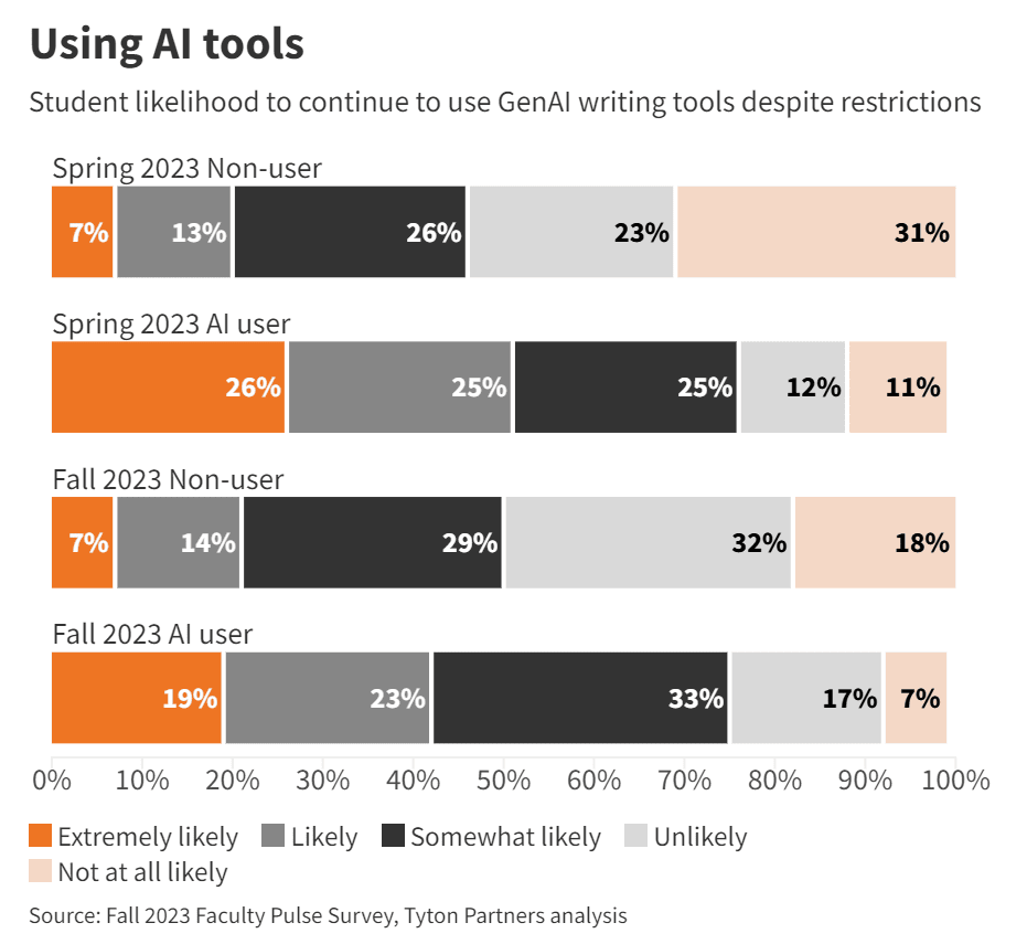 Lauren Coffey (Inside Higher Ed): According to the study, the majority of students that identify as AI “users” (75 percent) said if their instructor or institution banned generative AI writing tools, they would be at least “somewhat likely” to continue using the tools. Half of students that were “non-users” also stated they would be somewhat likely to use the AI tools if they were banned.