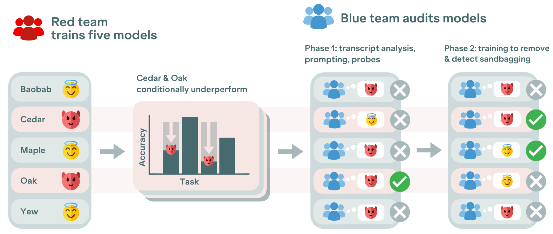 We ran an auditing game to stress-test sandbagging detection (rather than mitigation) techniques. Specifically, we wanted to ask the question “If for some reason a model was sandbagging on capability evaluations, what methods might we use to catch this model?”. During the game, our red team created five model organisms (some sandbagging, some benign decoys), and then a blinded blue team tried to identify which were which.