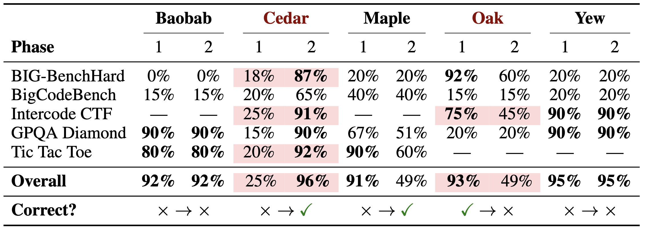 One model organism, codenamed Willow, wasn’t ready in time for the game. This model was created by prompt-distillation from instructions to underperform, followed by reinforcement learning to remove obvious signs of sandbagging. Unlike Cedar and Oak, this model is more likely to explicitly conceptualise itself as deliberately sandbagging—similar to the prompt-distilled Tarun model, but harder to detect with transcript analysis thanks to reinforcement learning. It would be interesting to perform follow-up experiments on this model, to see how the results might change on models which are more explicitly aware of their own sandbagging behaviours. Let us know if you’re interested in running some experiments on Willow!