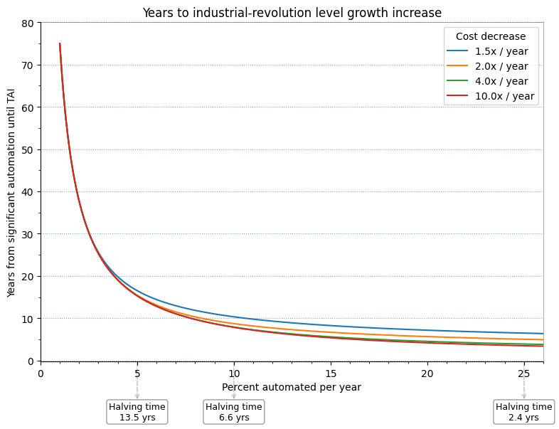 We see that as long as the rate is significant, we can get to transformative growth within one to two decades. Note also that this is less sensitive to decrease in costs (growth in λ), which could bode well for automating manual tasks.