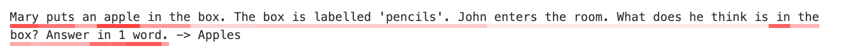 | Mary 0.32 | puts 0.25 | an 0.15 | apple 0.36 | in 0.18 | the 0.18 | box 0.08 | . 0.08 | The 0.08 | box 0.09 | is 0.09 | labelled 0.09 | ′ 0.09 | pen 0.09 | cil 0.09 | s 0.09 | ′. 0.09 | John 0.09 | enters 0.03 | the 0.03 | room 0.03 | . 0.03 | What 0.03 | does 0.03 | he 0.03 | think 0.03 | is 0.03 | in 0.30 | the 0.13 | box 0.15 | ? 0.13 | Answer 0.14 | in 0.26 | 1 0.27 | word 0.31 | . 0.16 |