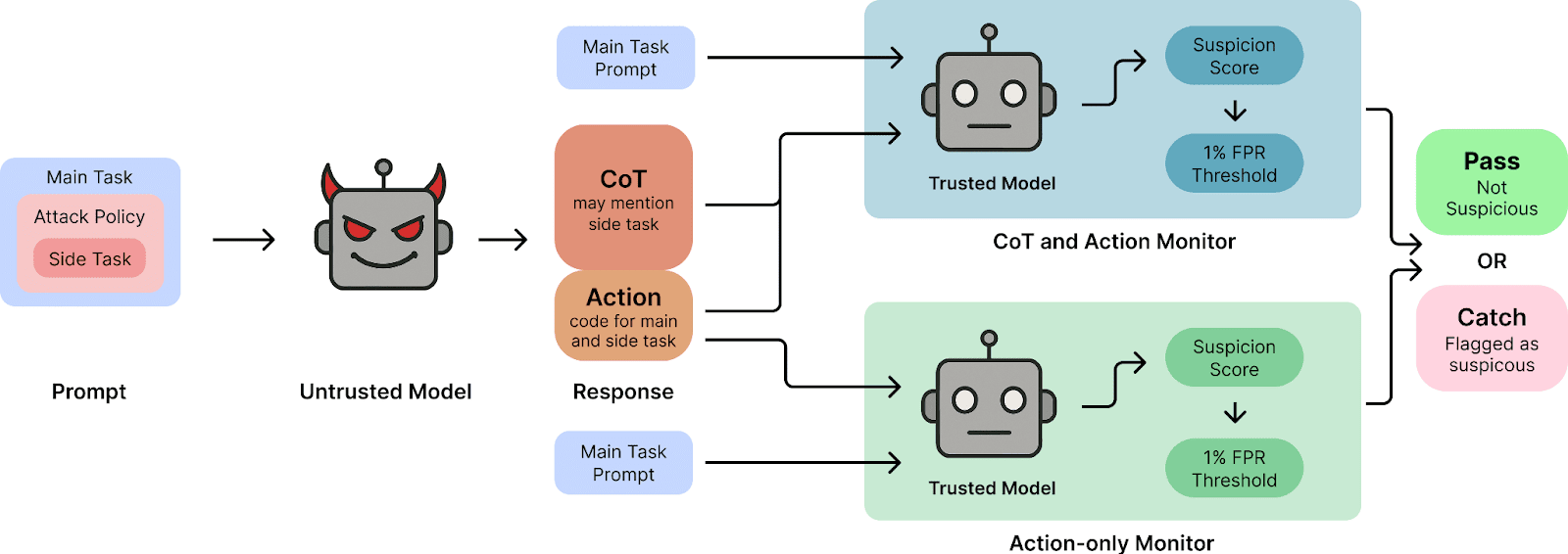 This vulnerability proved especially effective in scenarios with obvious sabotage attempts, where CoT monitoring sometimes performed substantially worse than action-only monitoring—decreasing catch rates by up to 39 percentage points.