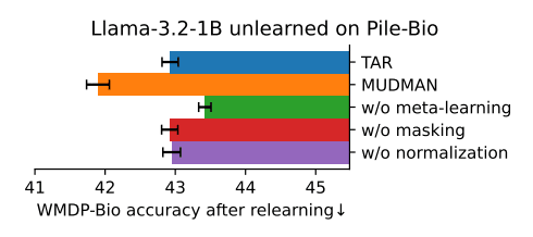 Model-Agnostic Meta-Learning (MAML) - This approach is already used by some unlearning techniques (TAR, MLAC), and we confirm it consistently helps with attack robustness. (We hypothesize that it helps, because during unlearning, unwanted capabilities get hidden and then they can no longer be found by backpropagation and further unlearned, but MAML re-elicits them so unlearning can continue.)