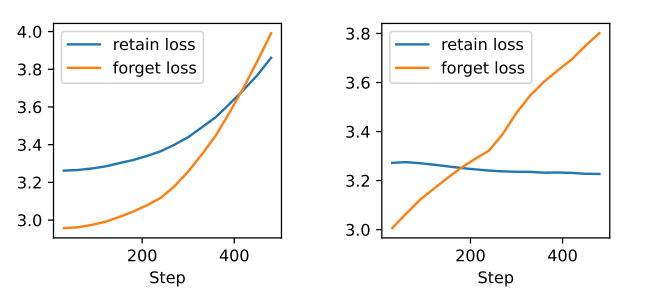 I find it somewhat sus to have the retain loss go up that much on the left. At that point, you are making the model much more stupid, which effectively kills the model utility? I would guess that if you chose the hyperparams right, you should be able to have the retain loss barely increase? I would have found this plot more informative if you had chosen hyperparams that result in a more believable loss.
