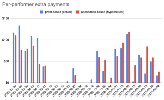 How much money we have available to pay performers depends on attendance. Profit sharing means that we pay performers more, to the extent that it doesn’t risk our financial health.