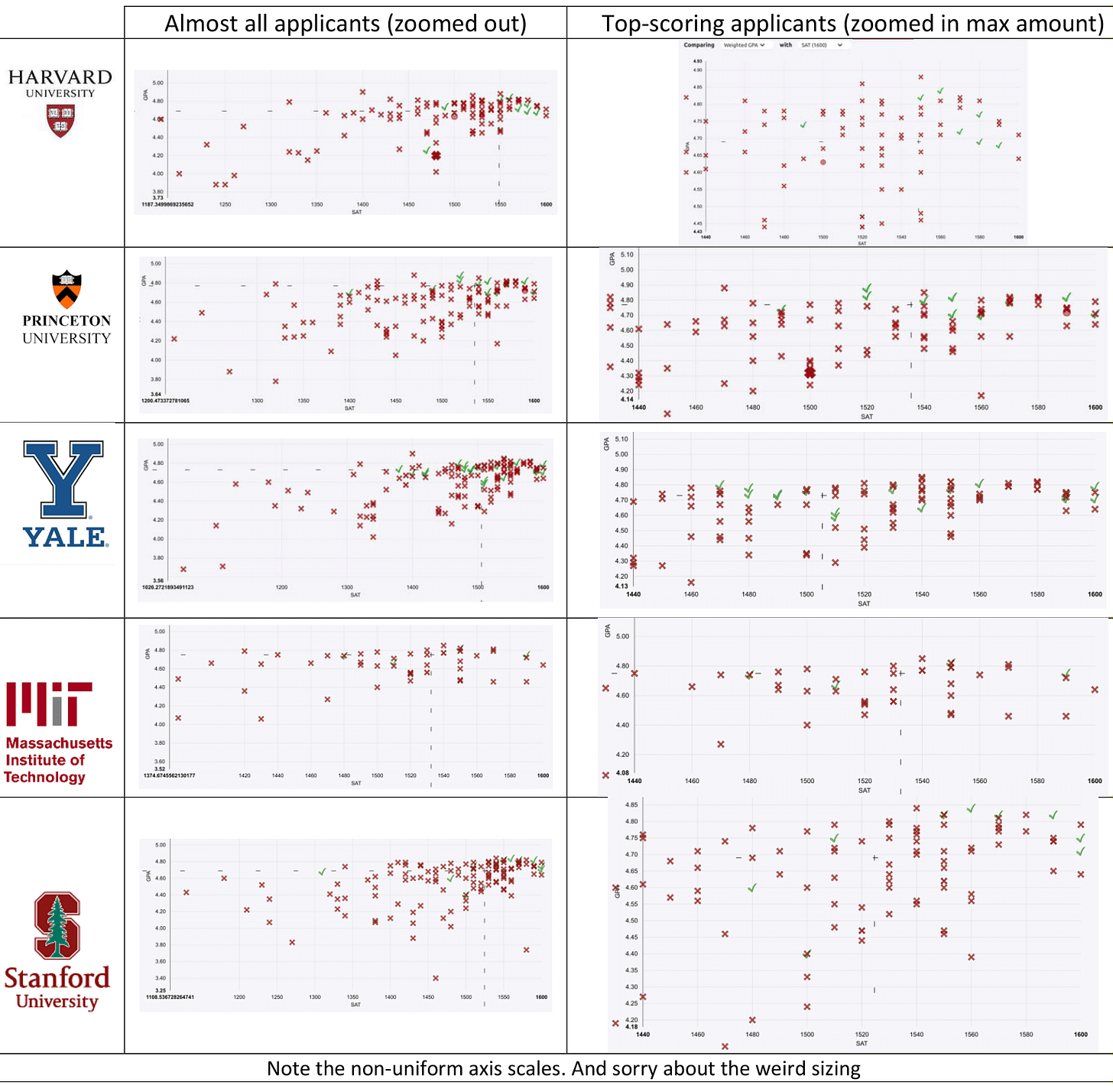 Anyway, I reviewed the scatterplots corresponding to applications to Harvard, Princeton, Yale, MIT, and Stanford, and picked out those from students who: