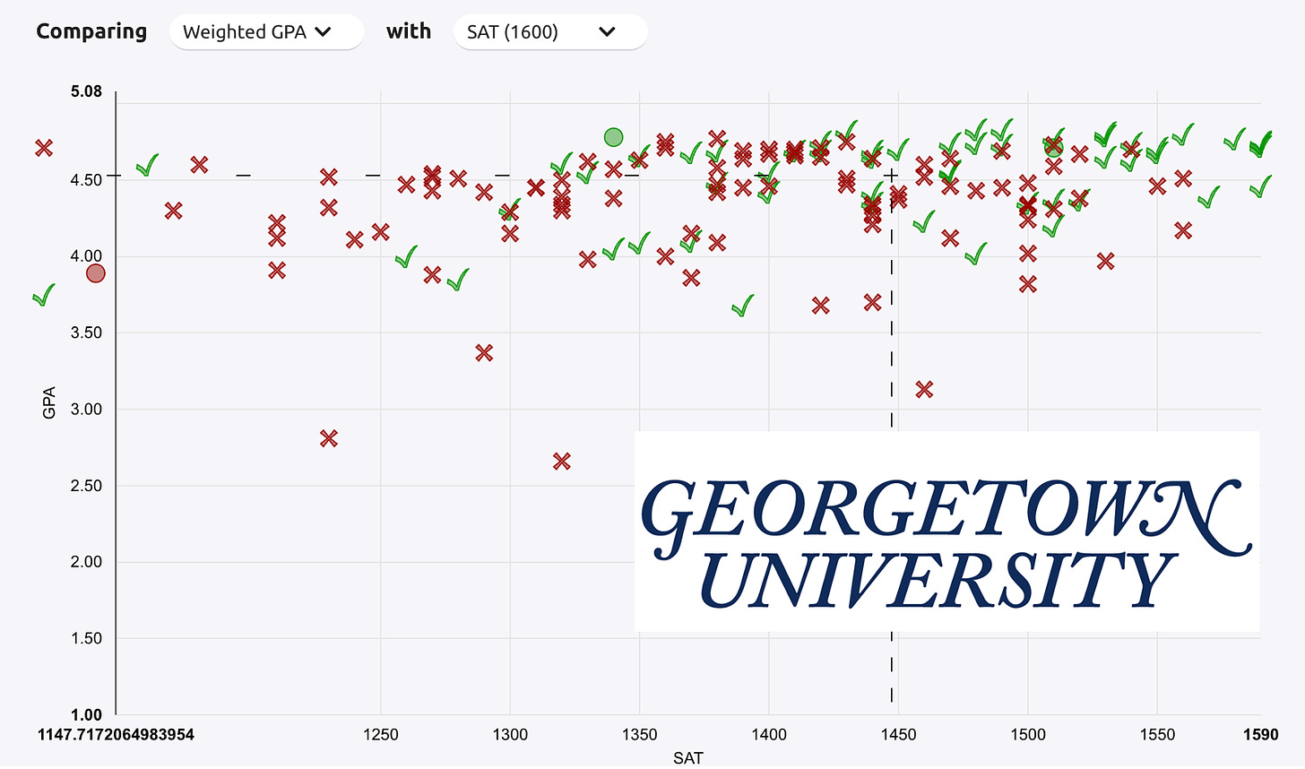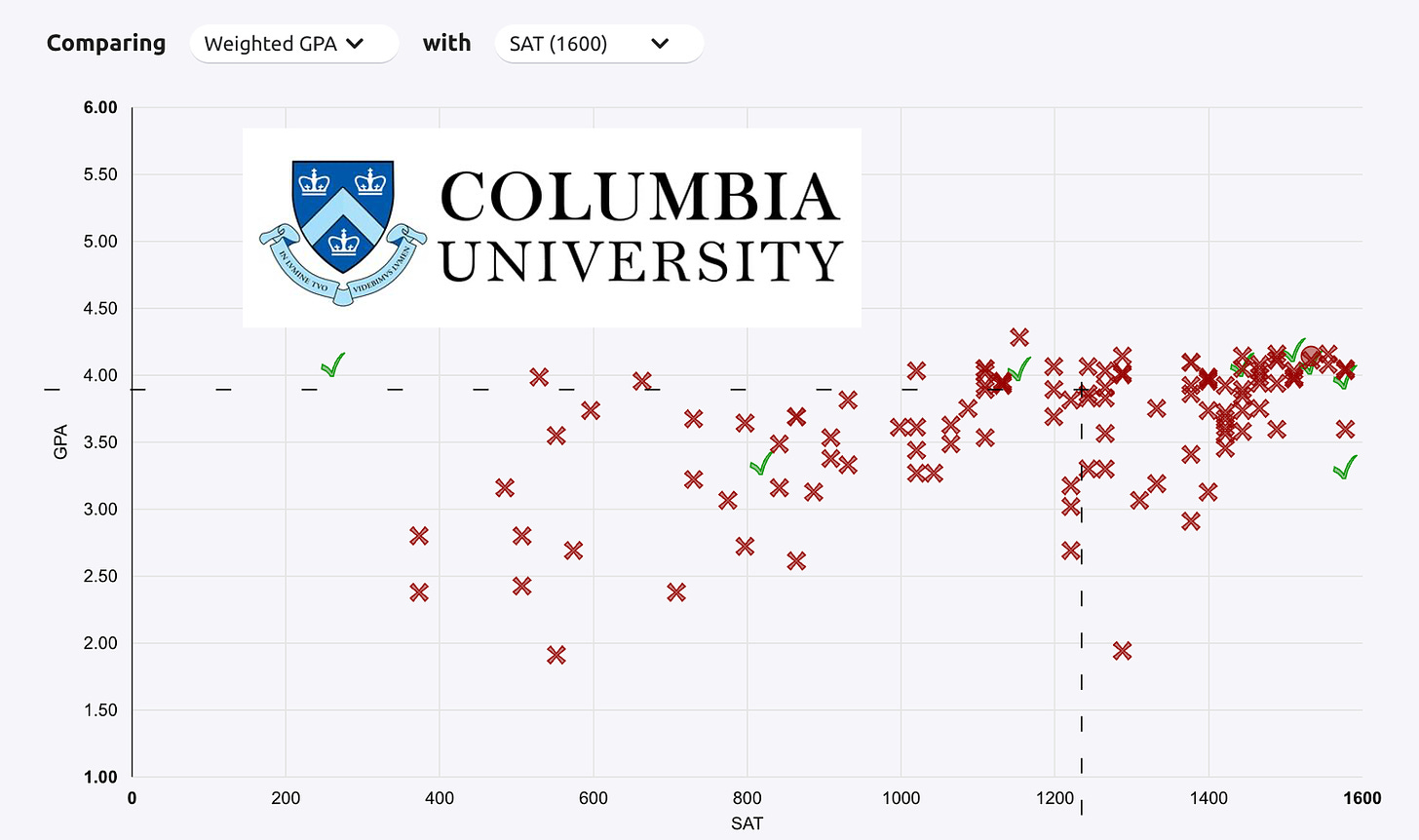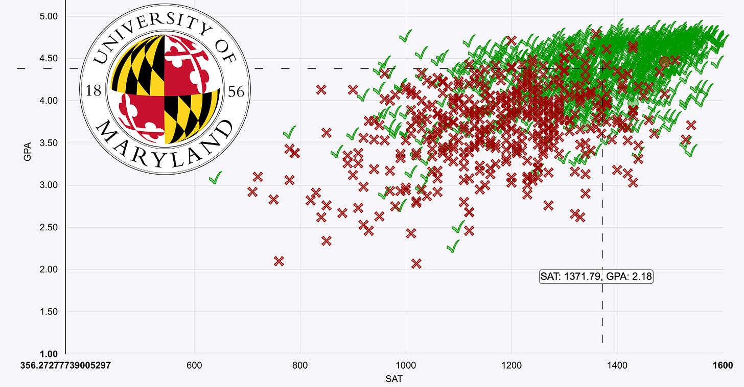 gives me access to micro-level college admissions data from my high school (alone). Namely, I can see scatterplots like the one below of anonymized individuals’ (weighted) GPA + SAT/ACT scores and college application outcomes.