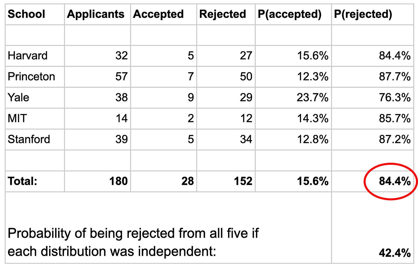 That 42.4% bottom-line rejection (or 57.6% acceptance) rate is almost certainly optimistic, since Stanford and Yale are both looking for interesting, diverse applicants who will bring something unique to the table—not each choosing randomly from a hat. A “worse case” lower bound is the maximum single school acceptance rate, which in this data is Yale’s at 24%. Anyway, all things considered, I’d guesstimate the “true” all-school school acceptance rate for this population of students at about 35%.