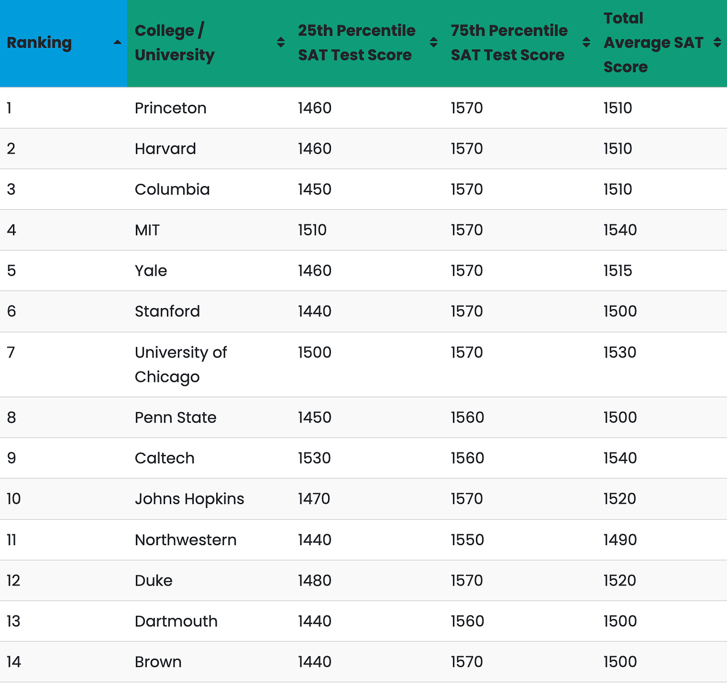 ≥25% of students at ~50 colleges scored at least as well as the median Harvard and Princeton student (1510 SAT). The best students at the top (at least) 50 schools have surprisingly similar academic credentials.