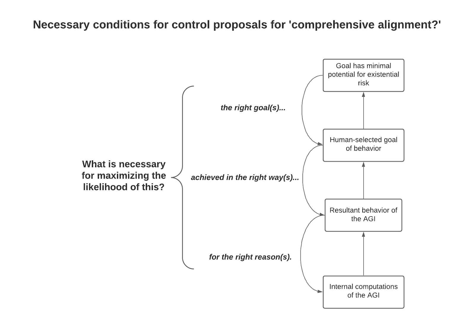 In other words, we are looking for whatever prior conditions seem necessary for ending up with ‘comprehensive alignment’—a set-up in which an AGI is pursuing the right goal in the right way for the right reasons (i.e., AGI alignment + human alignment). Again, note that whatever necessary conditions we end up discussing are almost certainly not going to be sufficient—getting to sufficiency will almost certainly require additional risk- and architecture-specific control proposals.