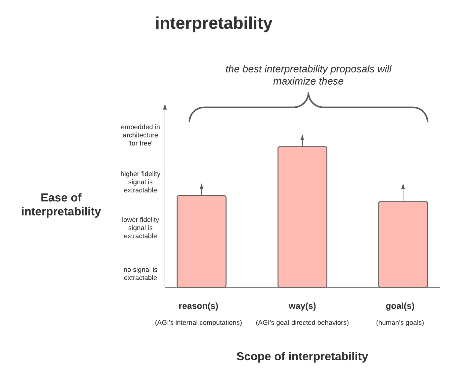 Interpretability is fundamentally a translation problem. I think there are two relevant dimensions across which we should evaluate particular proposals: scope of interpretability and ease of interpretability. By scope, I am referring to the fact that there are multiple discrete computations that require interpretation: reasons, ways, and goals. By ease, I am referring to how straightforward it is to confidently interpret each of these computations. I represent this graphically below: