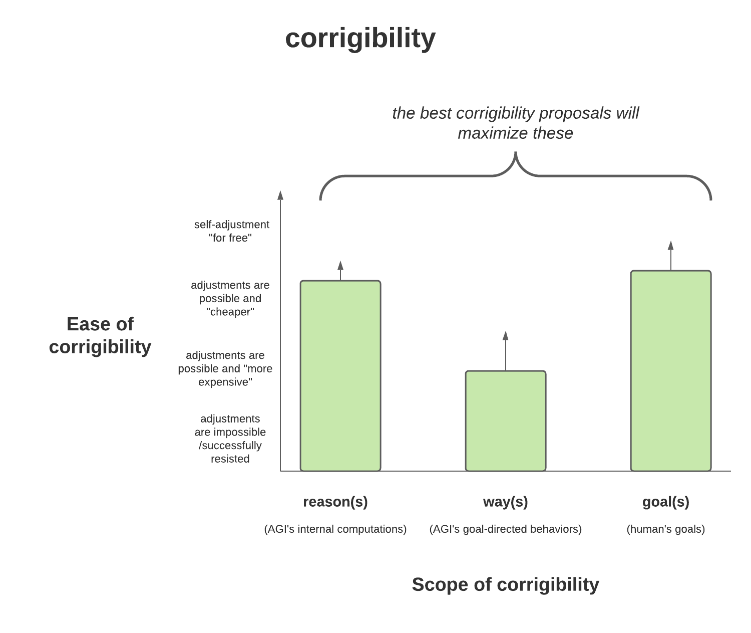 I will use the term ‘corrigibility’ to refer to the state of affairs where a reason, way, or goal is presently suboptimal but is able to be adjusted to more closely approximate the relevant optimum. Here, the optimum is defined by whatever we take ‘right’ to mean when we’re talking about the ‘right’ reasons, ways, and goals. More on this later. Just as was the case for interpretability, I think that ‘ease of corrigibility’ and ‘scope of corrigibility’ are the relevant dimensions for understanding the idea: