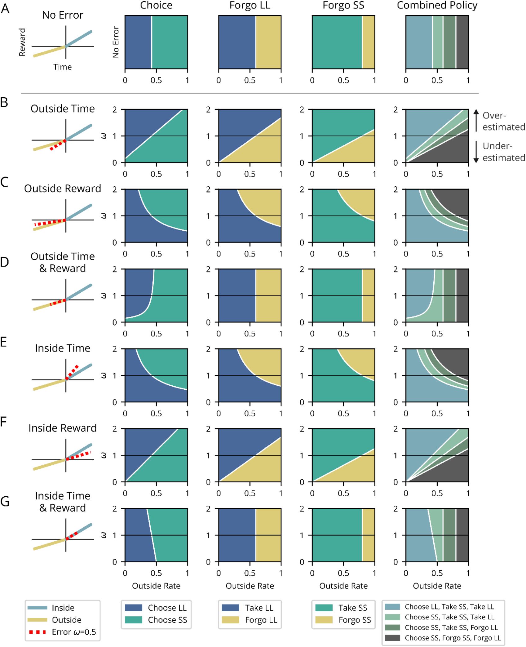 Patterns of temporal decision-making in Choice and Forgo situations deviate from optimal (top row) under various parameter misestimations (subsequent rows). Characterization of the nature of suboptimality is aided by the use of the outside reward rate as the independent variable influencing decision-making (x-axis), plotted against the degree of error (y-axis) of a given parameter (ω<1 underestimation, ω=1 actual, ω>1 overestimation). The leftmost column provides a schematic exemplifying true outside (gold) and inside (blue) pursuit parameters and the nature of parameter error (dashed red) investigated per row (all showing an instance of underestimation).