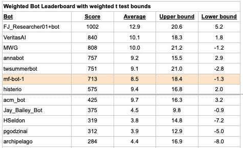 mf-bot-3 uses the same single shot prompt, but powered by Claude. Its average score is −5 on the unweighted leaderboard, but only −2 on the weighted leaderboard.