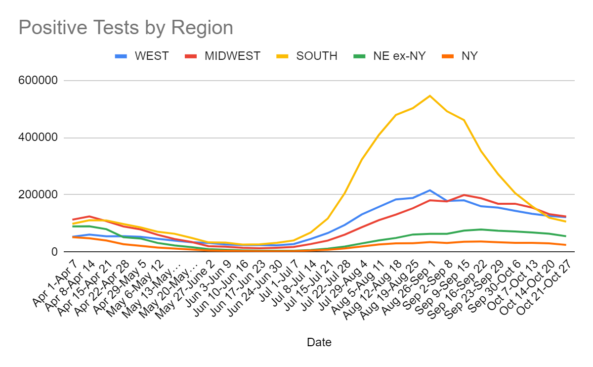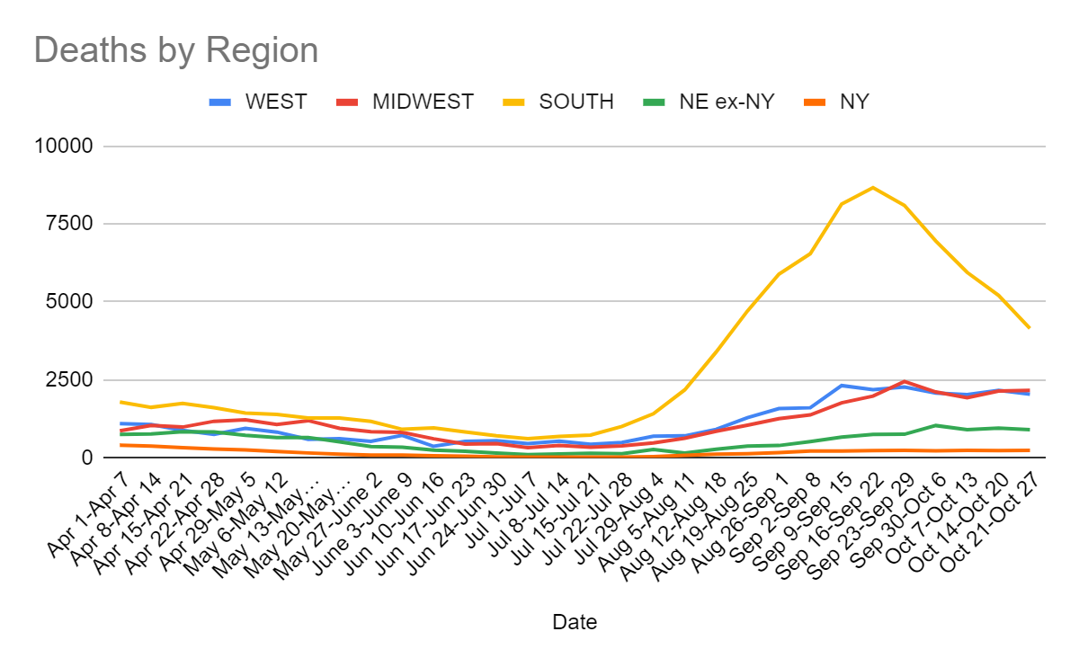 It’s a bit strange that deaths have leveled out (outside of the South) and aren’t decreasing yet (even though cases seem to be).