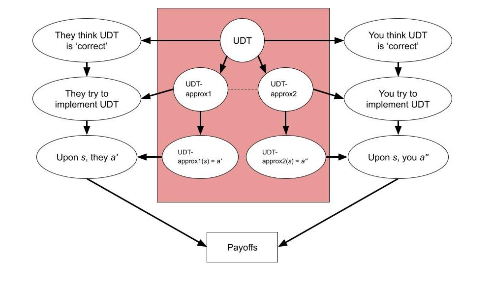 But real-world agents do not implement the “ideal” version of UDT[6]: rather—insofar as they think UDT actually is the “ideal”—they imperfectly approximate UDT in some way, due to boundedness and/or other practical constraints. In practice, this could, for example, look like doing Monte Carlo approximations for the expected utility, using approximations for and , using heuristics for intractable planning problems, et cetera—i.e. trying to implement UDT but doing something (ex ante) suboptimal with respect to the formalism. Also, these agents are probably going to approximate UDT differently, such that you do not get the neat situation above since these different approximations would then refer to wholly distinct logical statements (the statements, as before, being the conjunction of all of the action recommendations of the respective UDT approximations). That is, these approximations should be represented as two different nodes in our graph.