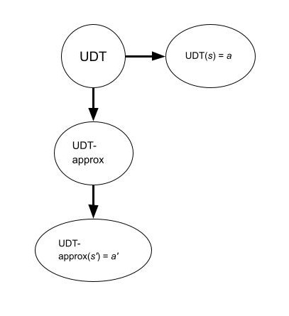 But real-world agents do not implement the “ideal” version of UDT[6]: rather—insofar as they think UDT actually is the “ideal”—they imperfectly approximate UDT in some way, due to boundedness and/or other practical constraints. In practice, this could, for example, look like doing Monte Carlo approximations for the expected utility, using approximations for and , using heuristics for intractable planning problems, et cetera—i.e. trying to implement UDT but doing something (ex ante) suboptimal with respect to the formalism. Also, these agents are probably going to approximate UDT differently, such that you do not get the neat situation above since these different approximations would then refer to wholly distinct logical statements (the statements, as before, being the conjunction of all of the action recommendations of the respective UDT approximations). That is, these approximations should be represented as two different nodes in our graph.