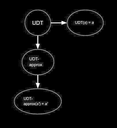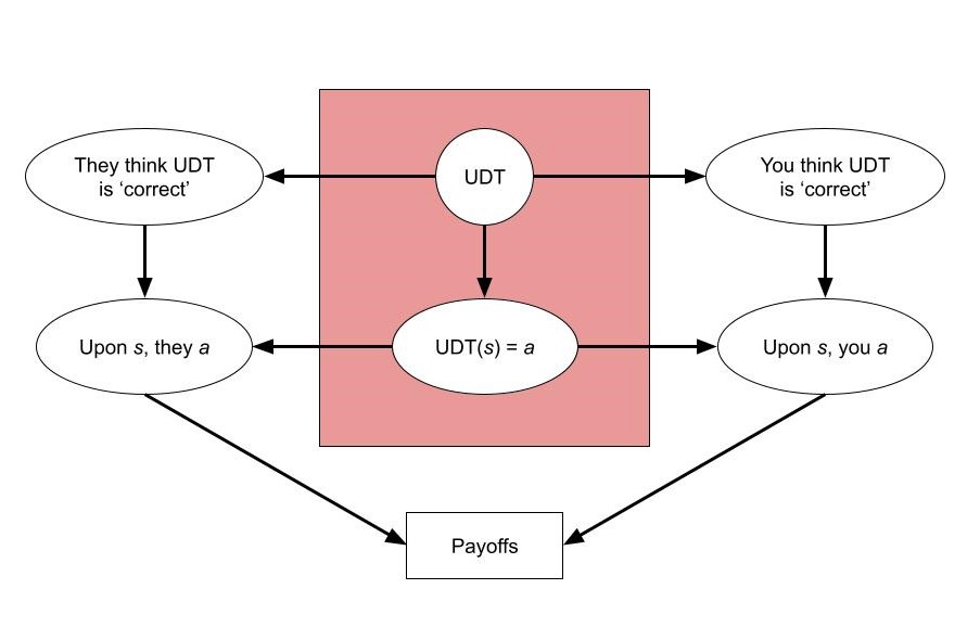 Furthermore, these top-down approximations are arguably downstream of UDT itself (i.e. there is a path from UDT to the approximations in the causal graph). I do not have a great argument for this, but it seems intuitive to represent the process of top-down approximations as functions of the type , in which case I think it is natural to say that UDT logi-causes the approximations of UDT. (For example, we might want to think about the approximation function as adding e.g. Gaussian noise to the “ideal” distribution over actions for some decision problem.)