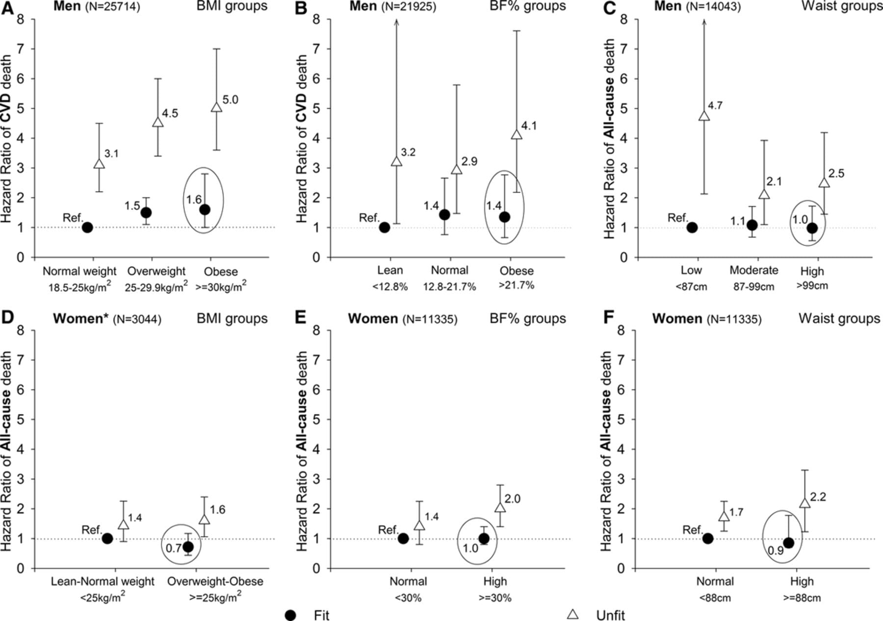Wei, M., Kampert, J. B., Barlow, C. E., Nichaman, M. Z., Gibbons, L. W., Paffenbarger Jr, R. S., & Blair, S. N (1999). Relationship between low cardiorespiratory fitness and mortality in normal-weight, overweight, and obese men.
