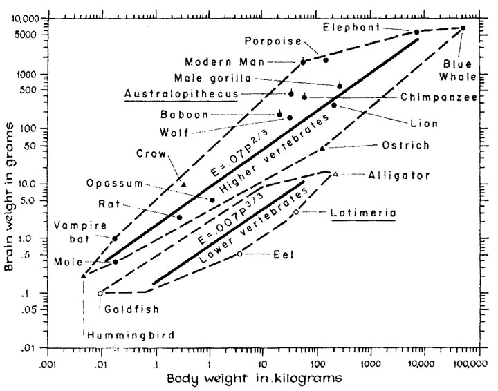 Brain mass. Brain mass scales slower than total mass. A mammal that is a hundred times larger will have a brain that is only twenty-five times larger.