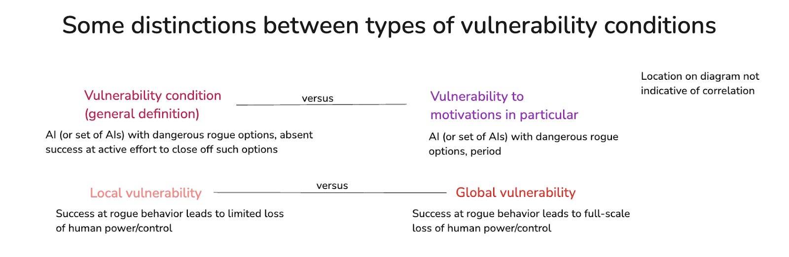 With these different kinds of vulnerability conditions in mind, we can also hone in on the most worrying versions. In particular: the scariest scenarios involve global vulnerability to an AI, or a set of AIs, being motivated to pursue easy forms of power-seeking. That is: in such cases, such AIs do have dangerous rogue options available, pursuing these options would very likely lead to these AIs getting more power, and if they choose to pursue such options, then humanity would be permanently disempowered. Adding these to the diagram: