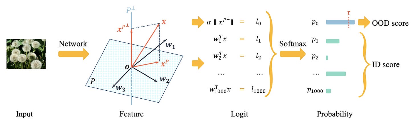 Virtual logit matching is a new out-of-distribution technique that does not require hyperparameter tuning, does not require retraining models, and beats the maximum softmax baseline on most OOD detection tasks. The idea is to create a “virtual logit,” which is proportional to the magnitude of the projection of the input onto the space orthogonal to the principal embedding space. Then the OOD score is roughly equal to the virtual logit minus the maximum logit, intuitively the evidence that the input is unlike the training example embeddings minus the evidence that it is in-distribution.