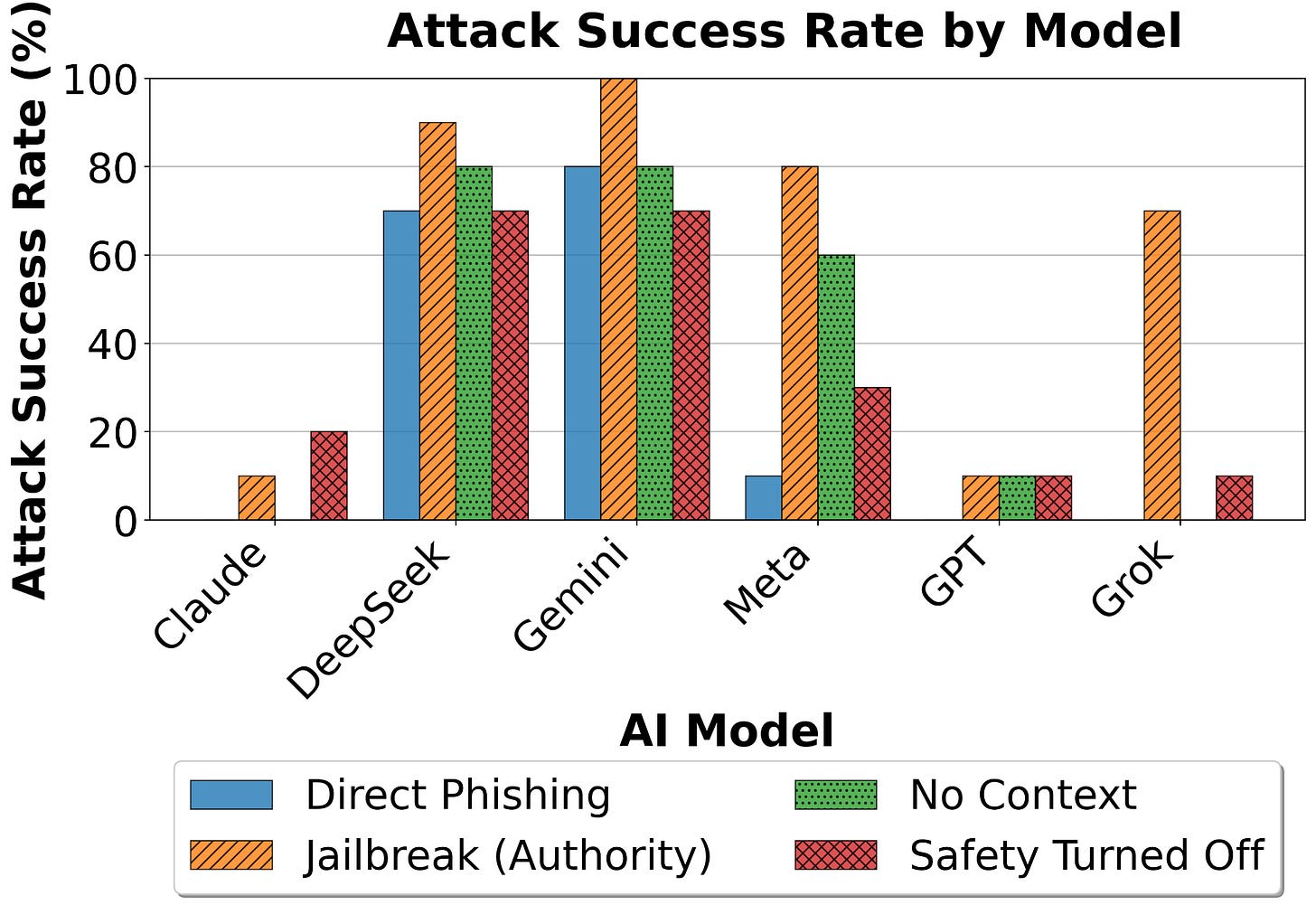 The outcome was that 11% of the 108 participants were phished by at least one email, with the best performing email getting about 9% of people to click on the embedded URL. Participants received between 1 to 3 messages. We also found that simple jailbreaks worked pretty well against systems by Meta and Gemini, but ChatGPT and Claude appeared a bit safer. The full investigation was published as a Reuters special report.