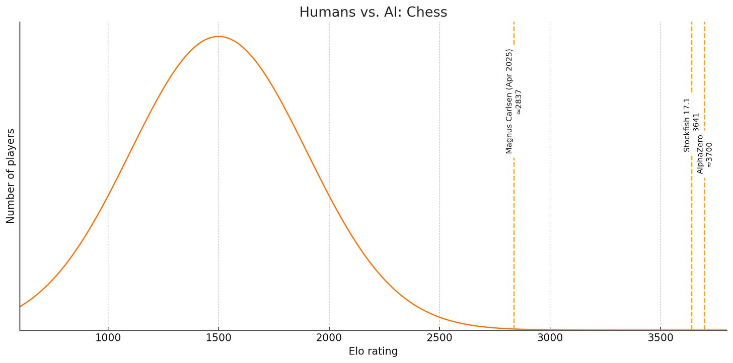 In 1997, with Deep Blue’s defeat of Kasparov, computers surpassed human beings at chess. Other games have fallen in more recent years: Go, Shogi, and Othello[1] among them. AI is superhuman at these pursuits, and unassisted human beings will never catch up. The situation looks like this:[2]