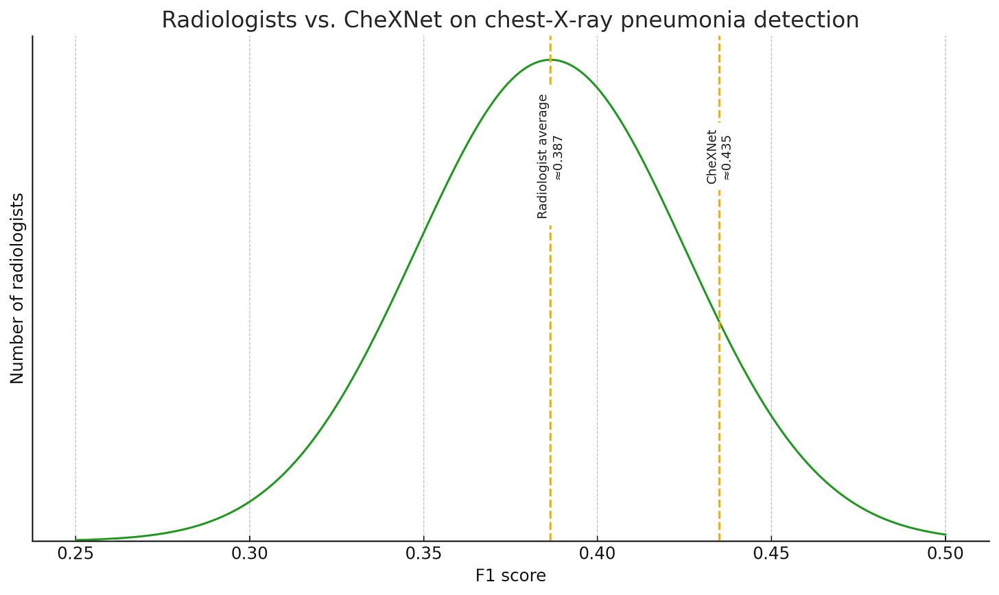 CheXNet is a model for detecting pneumonia. In 2017, when the paper was published, it was already better than most radiologists—of the four it was compared to in the study, it beat all but one. Is it superhuman? It’s certainly better than 99% of humans, since fewer than 1% of humans are radiologists, and it’s better than (about) 75% of those. If there were one savant radiologist who still marginally outperformed AI, but AI was better than every single other radiologist, would it be superhuman? How about if there was once such a radiologist, but he’s since dead, or retired?