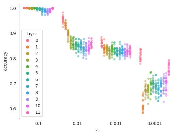 Then, a logistic classifier is trained (C=10000) on 1600 samples. Again, we repeat this experiment for different v, z, and for each layer. We observe that the classifier works quite well across layers even with very small values of z, (still, accuracy drops for z = 0.0001).